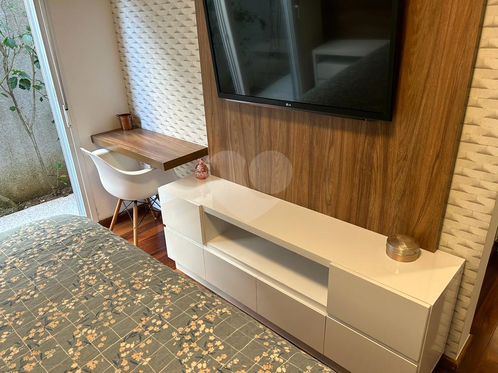Suíte principal com porta balcão, closet, ar-condicionado quente/frio, painel de cabeceira, painel com rack para TV e gabinete nos banheiros.