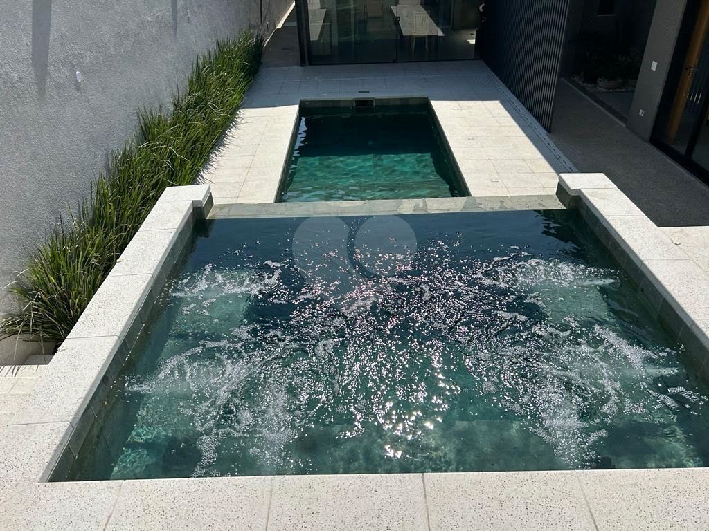 Piscina aquecida (solar e trocador de calor). Deck molhado, prainha, e Spa com cascata. Revestida em pedra Vulcânica Hijau, borda e piso atérmico Castelatto.