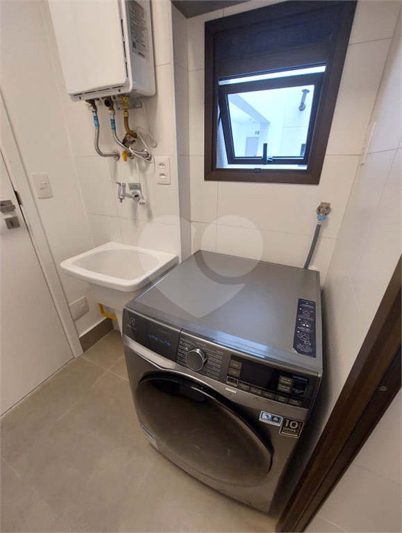 A cozinha está completa, com armários planejados, fogão cooktop 4 bocas, depurador, forno elétrico, micro-ondas e geladeira. Na área de serviço, armário planejado e lavadora lava e seca. O aquecedor de água atende cozinha e chuveiros.