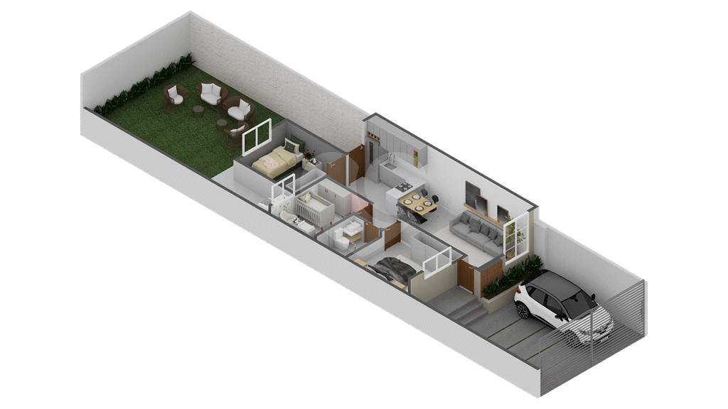 Ambientes amplos, bem iluminados e ventilados, pé direito alto na sala, piso em porcelanato, pias e soleiras em granito, sala, cozinha, lavanderia, banheiro, garagem espaçosa para 2 carros.