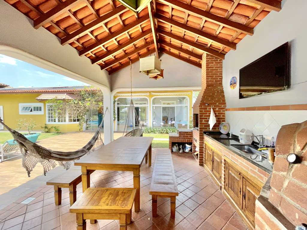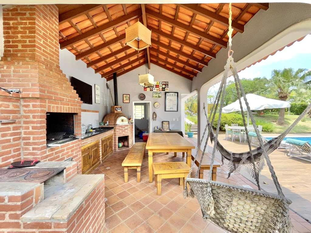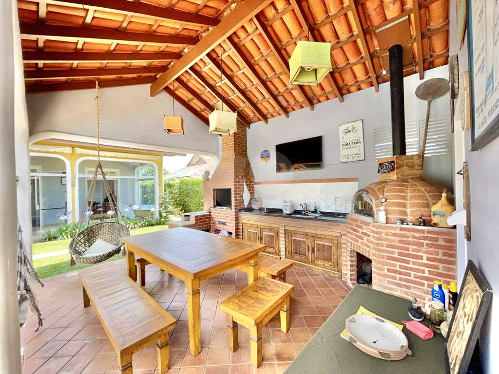 Anexo gourmet com churrasqueira, fogão à lenha, forno de pizza, bancada em granito, cuba inox, gabinetes e despensa repleta de armários.