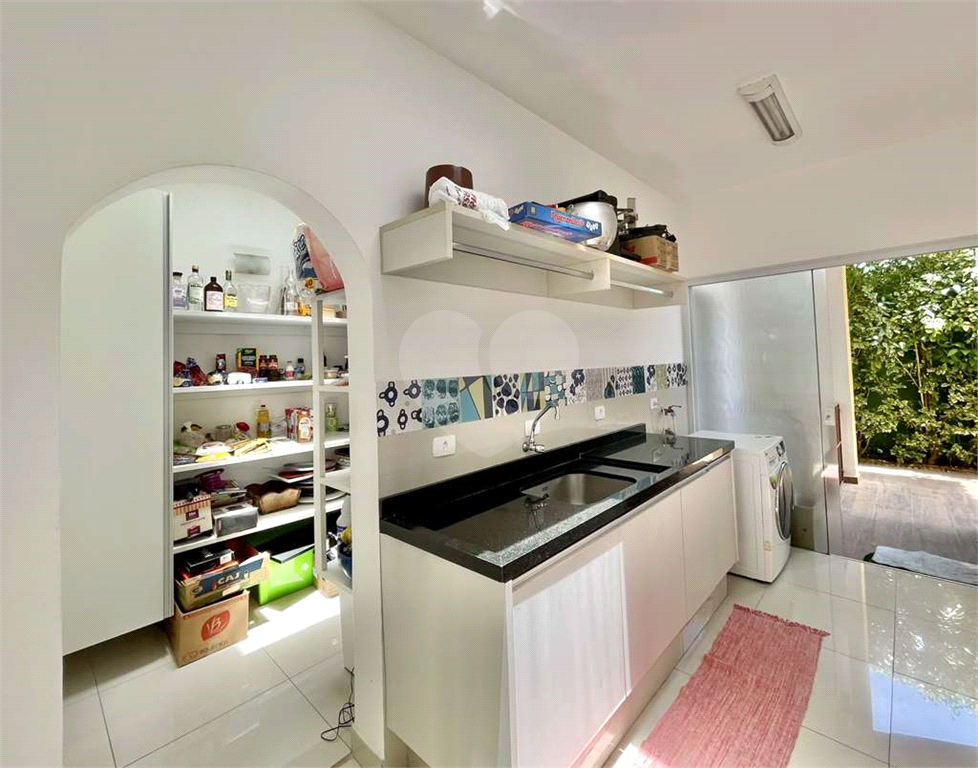 Área de serviço aberta ensolarada e lavanderia fechada com tanque inox, bancada em granito e gabinetes.