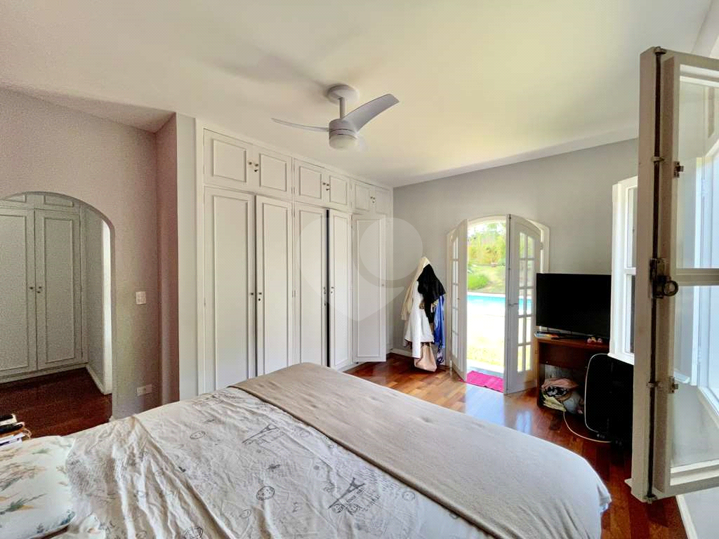 5 dormitórios sendo 2 suítes: 3 dorms com armários embutidos de marcenaria. A suíte master com ventilador, closet, armários e porta balcão voltada para o jardim com piscina. Uma das suítes ideal para hóspedes, ao lado da área de serviço.