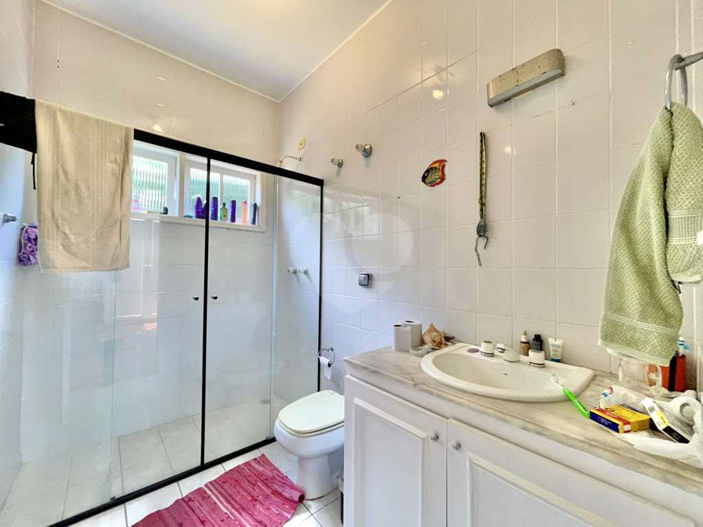 Banheiros com tampo em mármore, espelho, gabinetes e box de vidro e pastilhas, sendo a máster com hidro dupla.