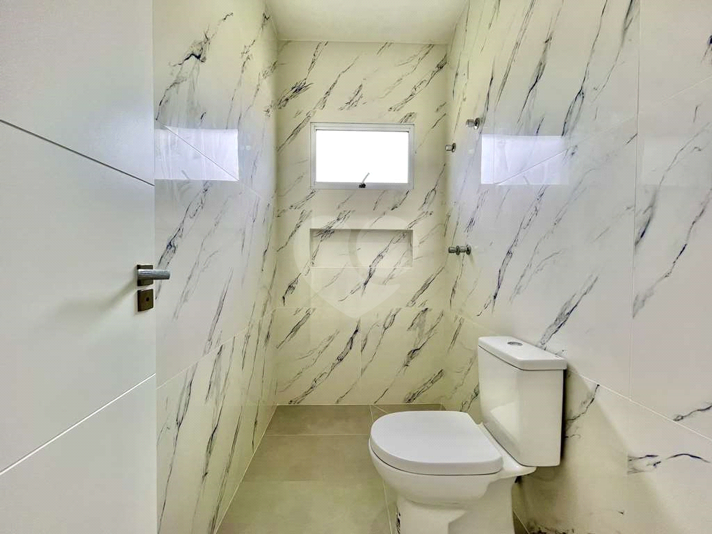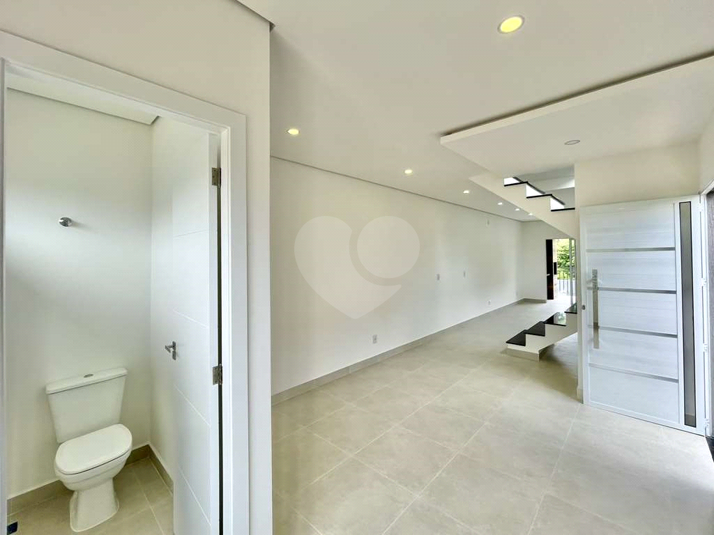 Living com piso em porcelanato e lavabo.