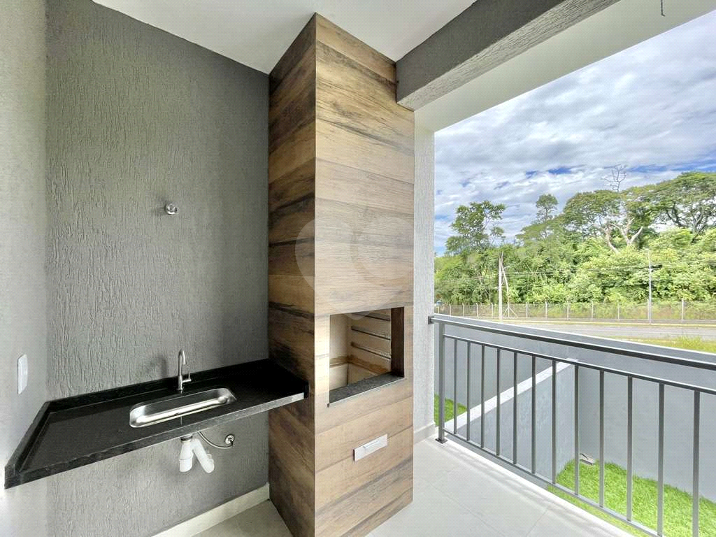 Varanda gourmet com churrasqueira e pia.